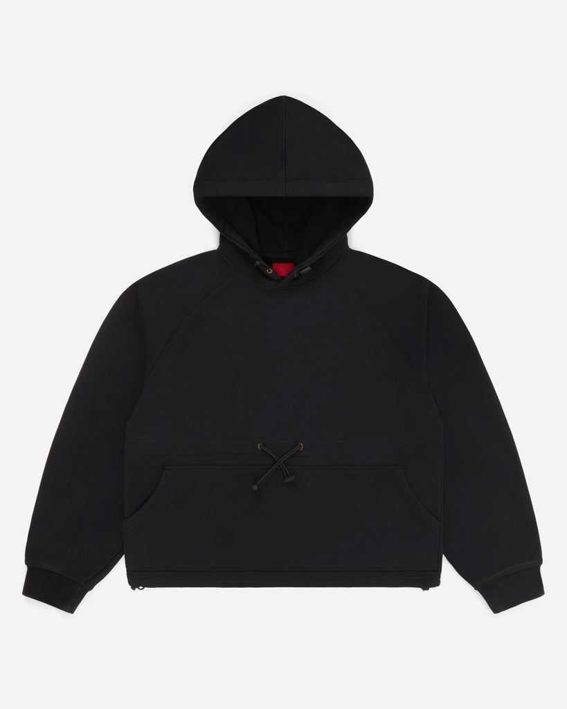 washed 14oz cotton fleece hoodie with cinchable waist, body, and hood, embroidered chest graphic, raglan sleeve construction, and boxy fit.