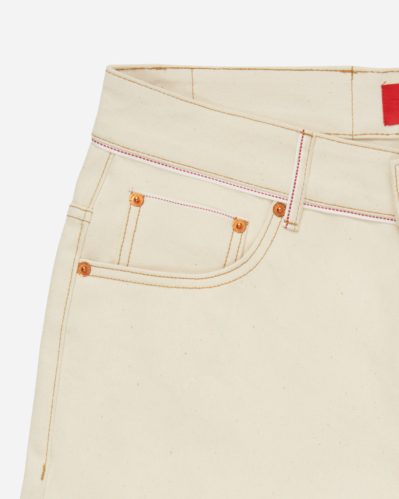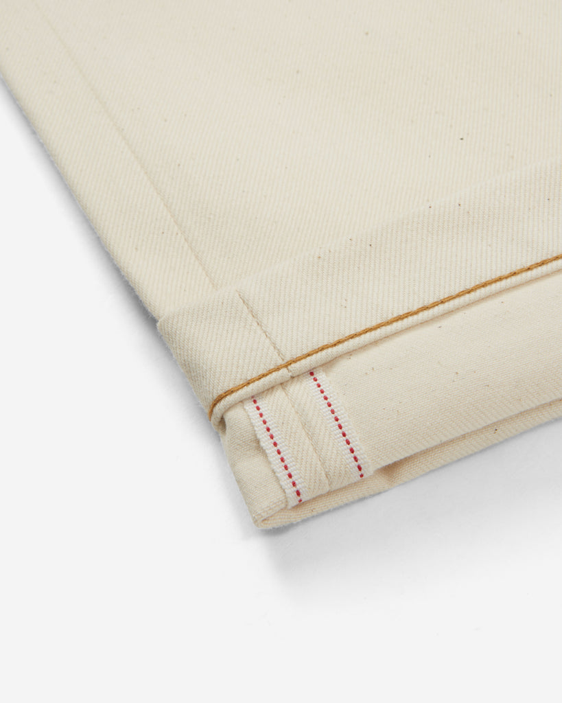 unwashed 14.5oz cotton denim jeans with metal button fly, leather back patch, and selvedge outseams, waistband, coin pocket, back pockets, belt loops and fly, and baggy fit.