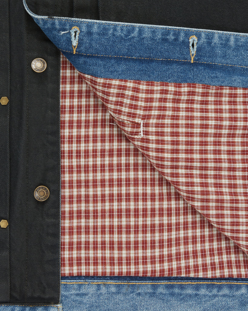 washed and coated heavyweight 15oz cotton denim jacket with metal rivets, metal button closure, cotton check lining, leather back patch, and cropped boxy fit.