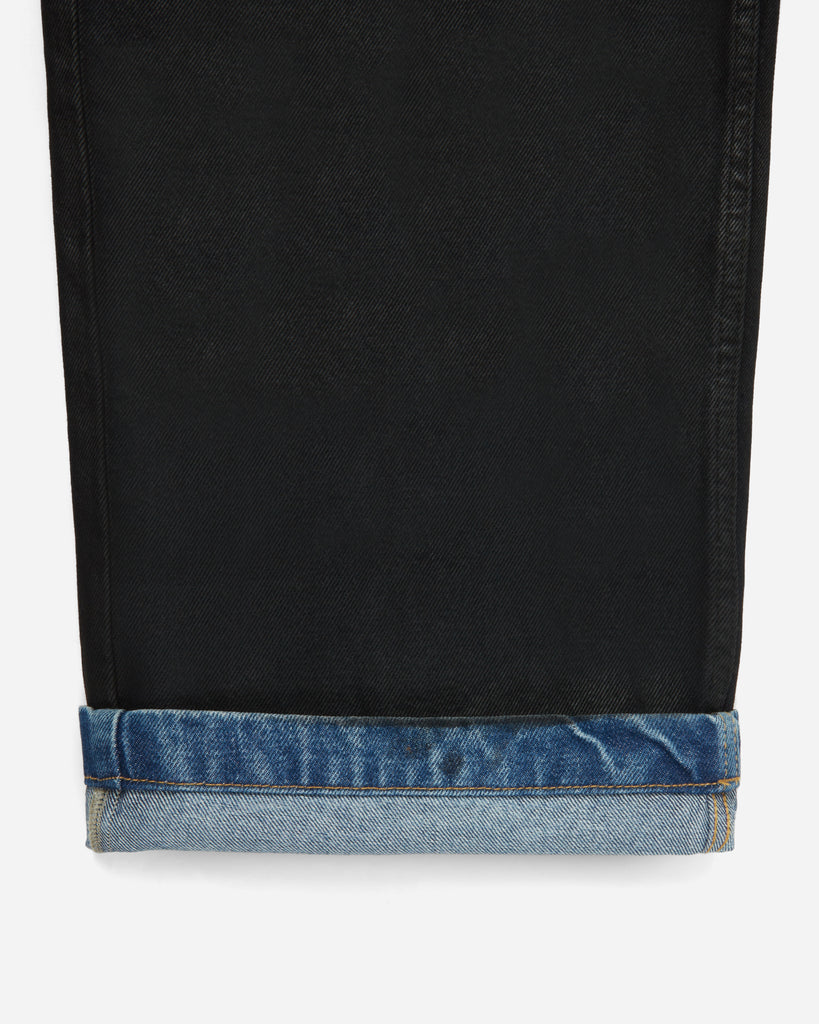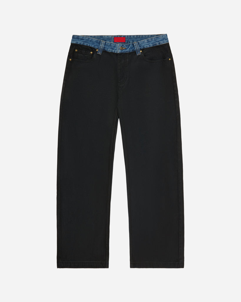 washed and coated heavyweight 15oz cotton denim jeans with metal button fly, metal rivets, oversized leather back patch, and baggy fit.