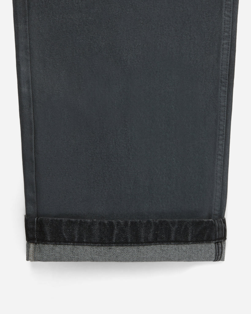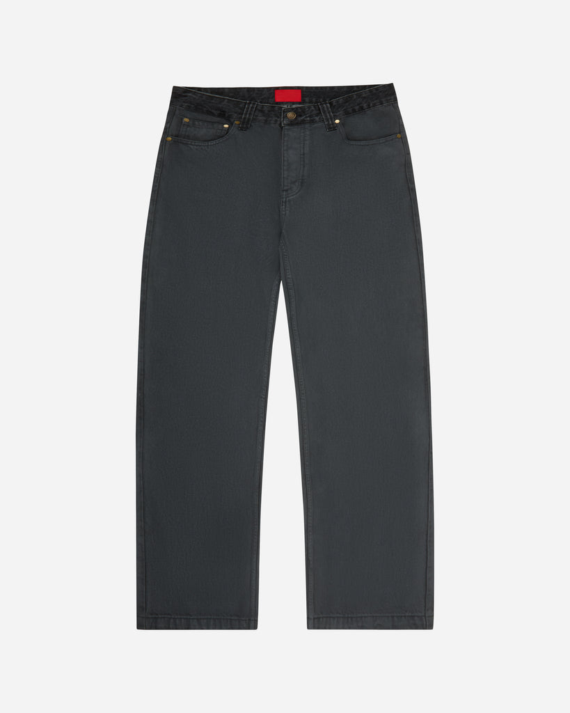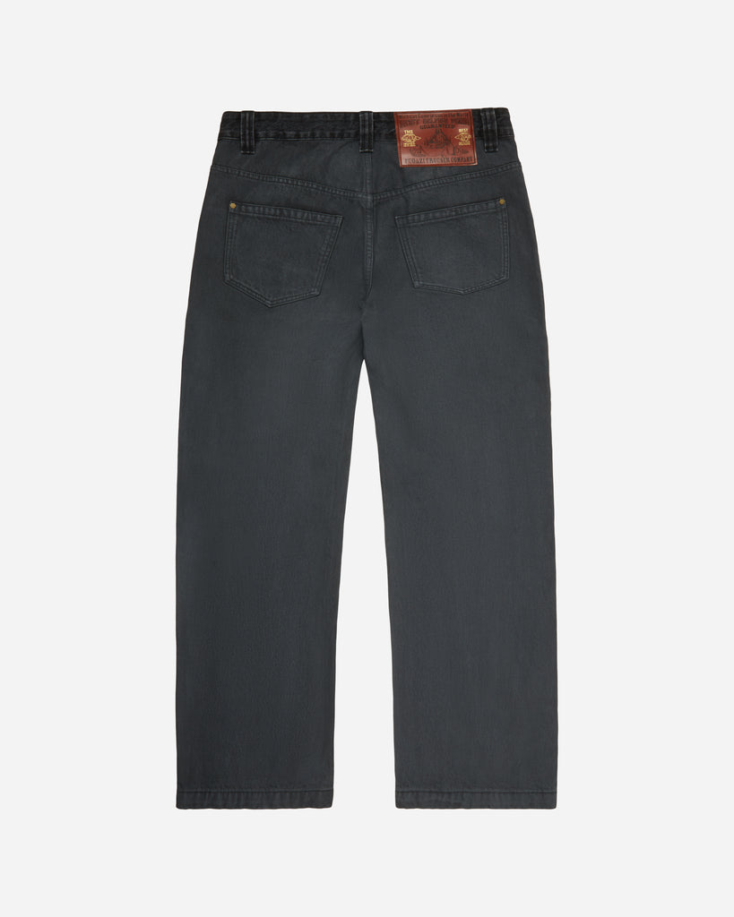 washed and coated heavyweight 15oz cotton denim jeans with metal button fly, metal rivets, oversized leather back patch, and baggy fit.