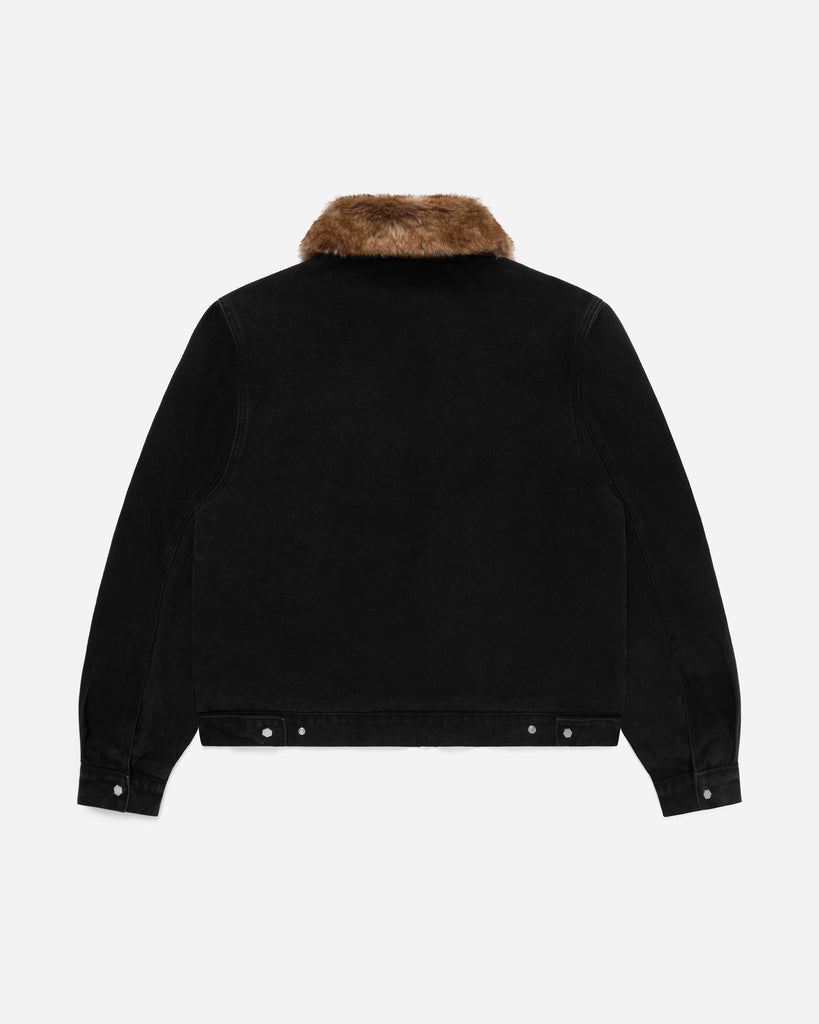 washed heavyweight 16oz cotton canvas jacket with removable fur collar, two-way YKK zip closure, fireman clasps, double layered hand pockets, leather collar, 11.8oz blanket lining, and boxy fit.