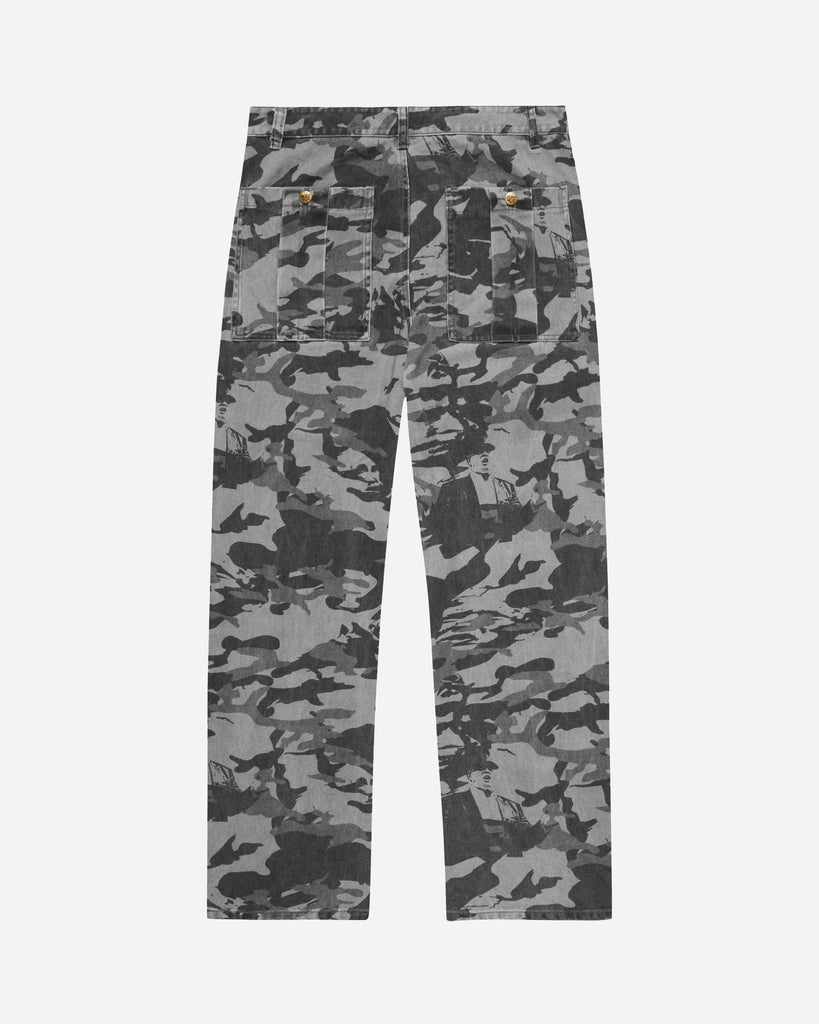 washed heavyweight 11oz cotton twill cargo pants with snap closure pockets, metal button fly, and printed pattern.