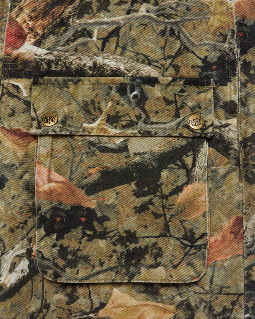 washed heavyweight 11oz cotton twill cargo pants with snap closure pockets, metal button fly, and printed pattern.