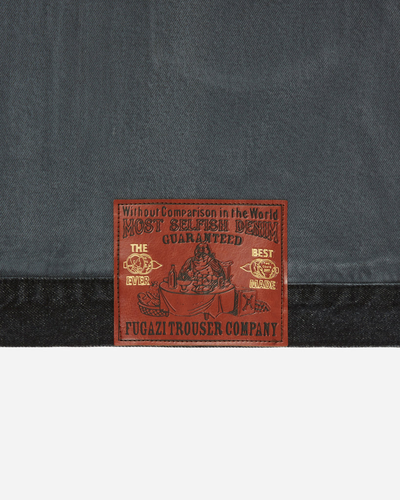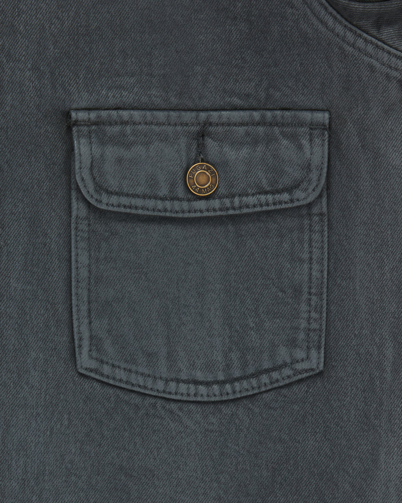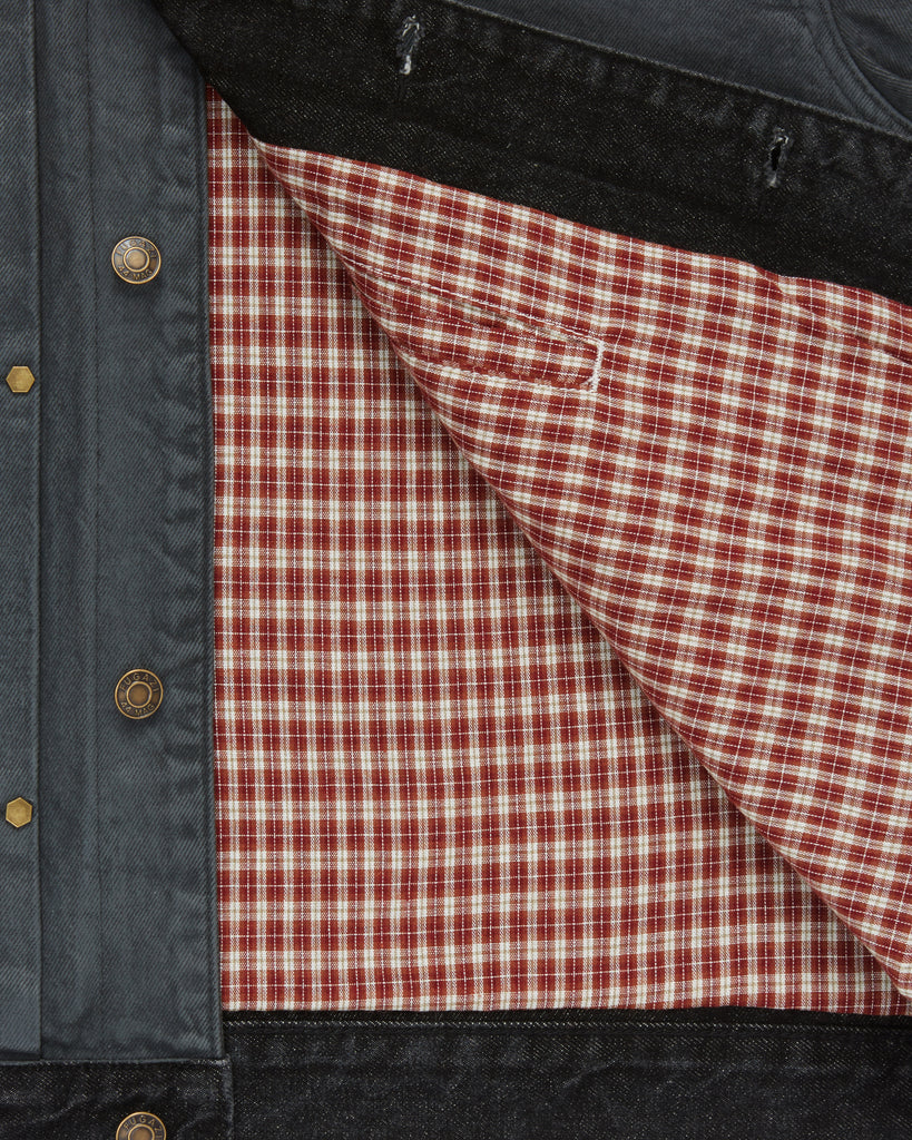 washed and coated heavyweight 15oz cotton denim jacket with metal rivets, metal button closure, cotton check lining, leather back patch, and cropped boxy fit.