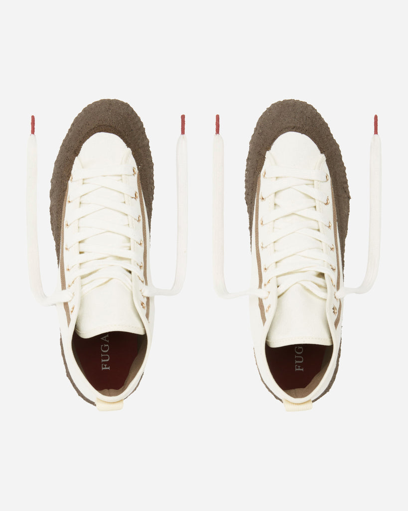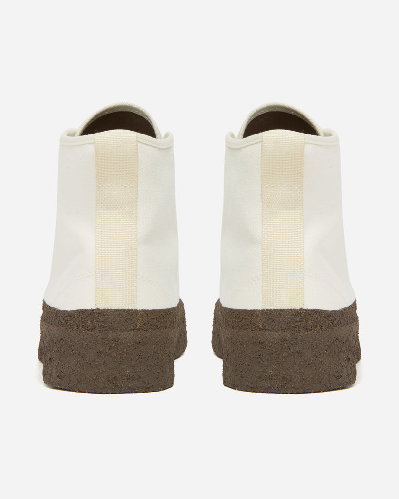 double-faced canvas high-top sneaker with rubber-dipped vulcanized sole, toe cap, and aglets and metal bullet hole eyelets.